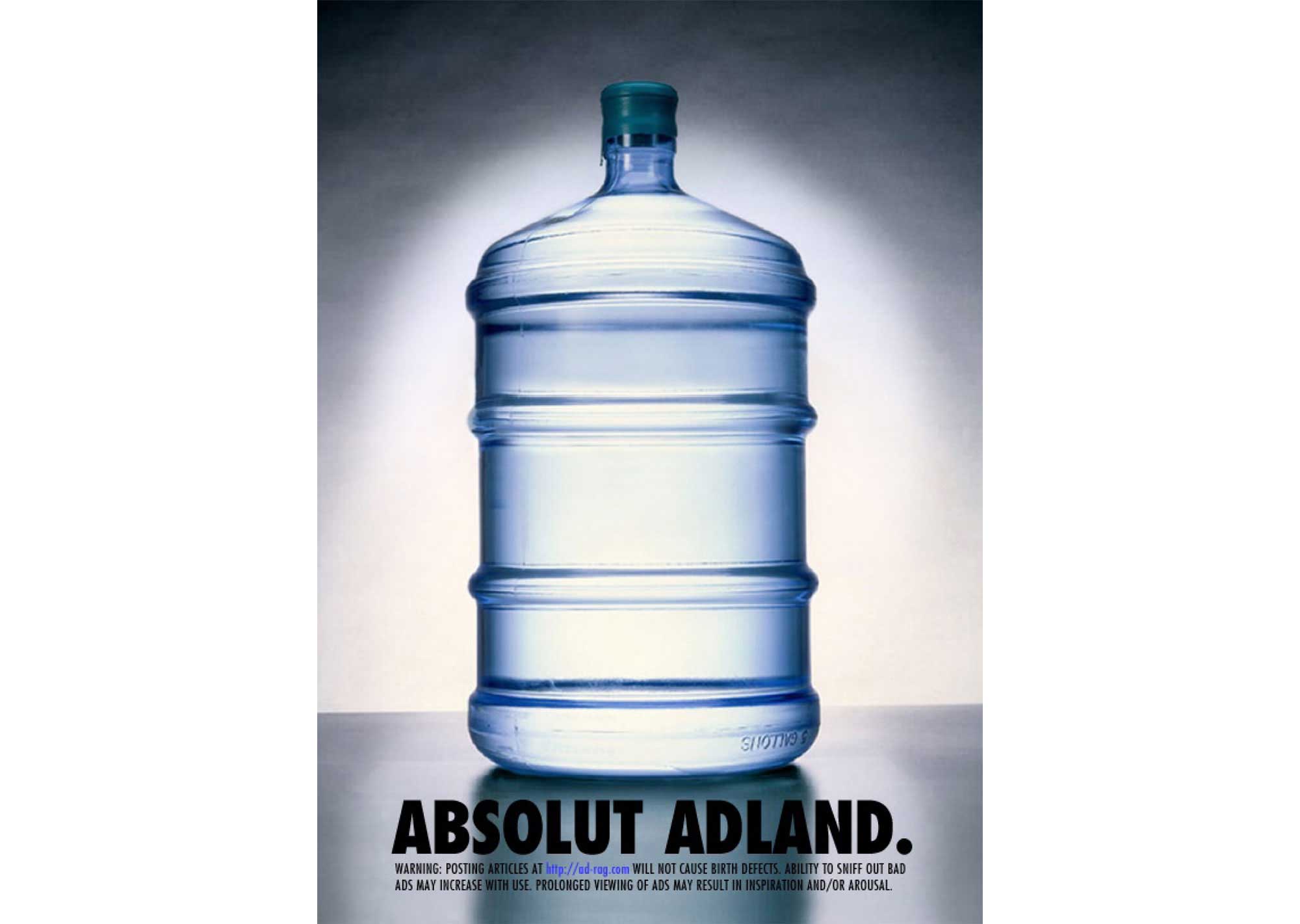 A parody of the Absolut bottle campaign, but with a water cooler bottle instead sums up what the site really is.