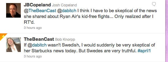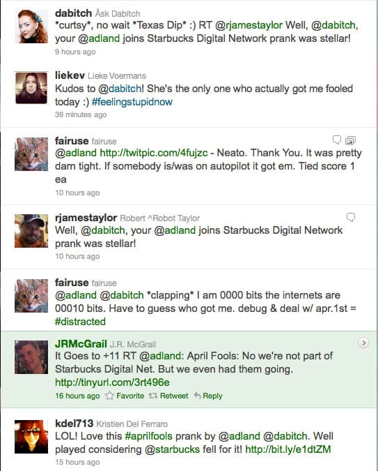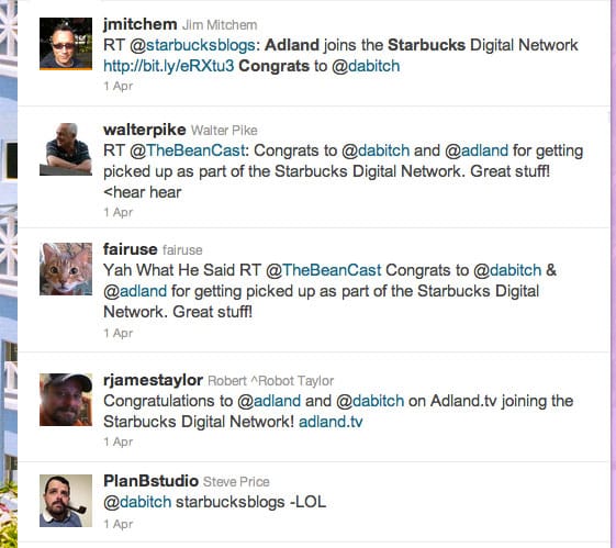 April Fools: No we're not part of Starbucks Digital Network was now way easy to write, and I could finally remove the straight face I'd been wearing all day. exhale Oh, and I finally got my little red TV logo back on twitter and Adland, I had missed it so.