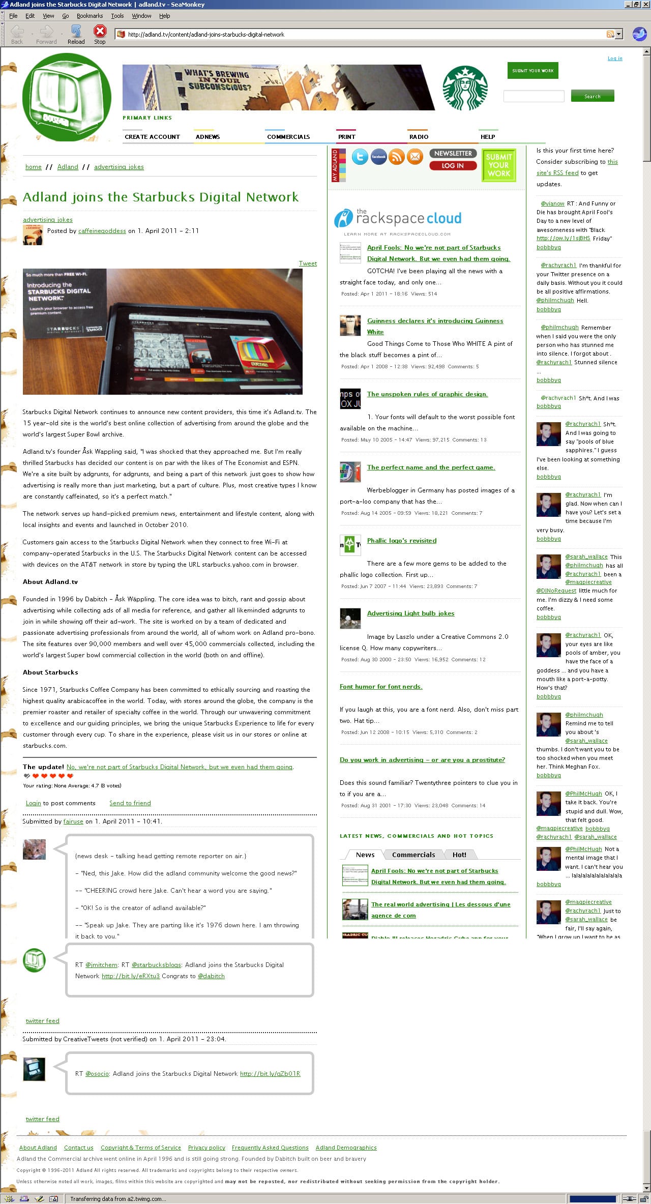 In the middle of the night here (ie; after midnight! So it was April 1) the release went up: Adland joins Starbucks Digital Network, while the site turned green and coffee-stained, and I went to get a few hours of shuteye.
