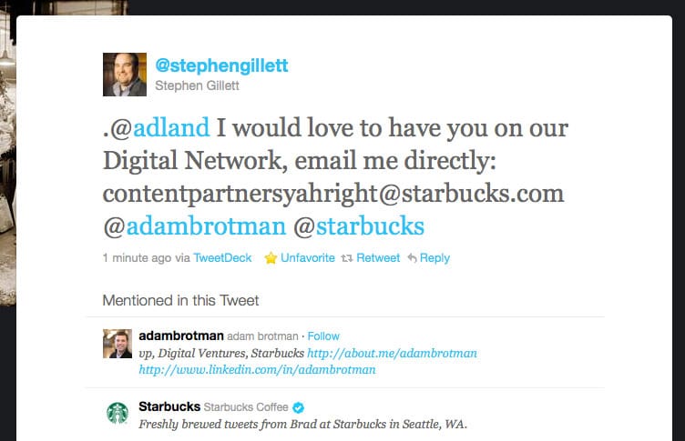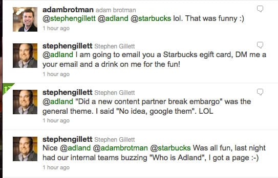 Quite pleased with myself I was getting ready to pull the prank down, trying to write a proper closure post for the prank during the afternoon energy-dip, when all of a sudden @adland received a tweet from @stephengillett, The Business & Technology Leader, CIO & EVP, Digital Ventures at Starbucks. My jaw dropped, I screendumped and shrieked "Is this for REAL!?" over the adlist mailinglist before it dawned on me, and then giggly adlisters came back with "No, it's the "yahright" part of the email that gives it away. Man, he got me back!