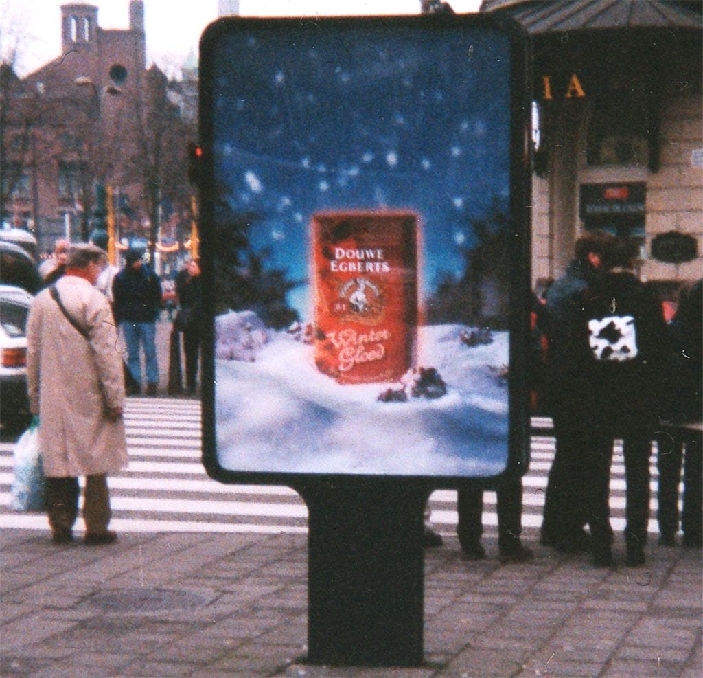 This poster sold “Winter Gloed” (gloed as in amber/glow – heat) by showing the warm red packaging in a snowy scene during the day. When the abri lit up at night the packaging would glow as the scene around it turned into a dark starry night.