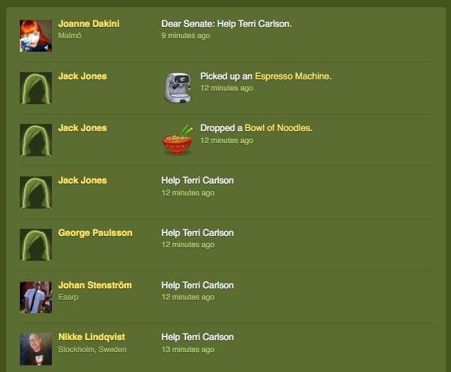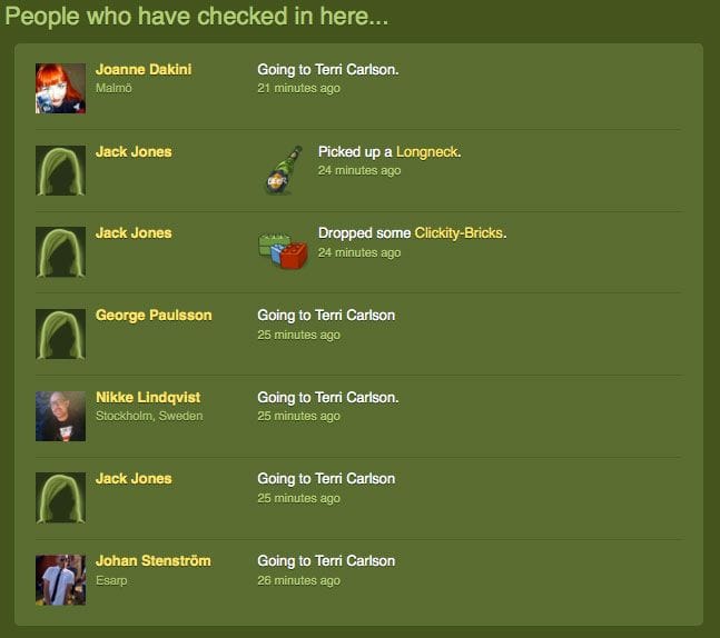 See also Jonk the pirate boys notes on Gowalla Flashmob and Gowalla Flashmob posted by John Ankarström, and Flashmob i Gowalla posted by Nikkelin (if you read Swedish). See also Artoo "I'm a hacker" (Swedish) Update! Terri likes us! also noted by Jonk the pirate boy