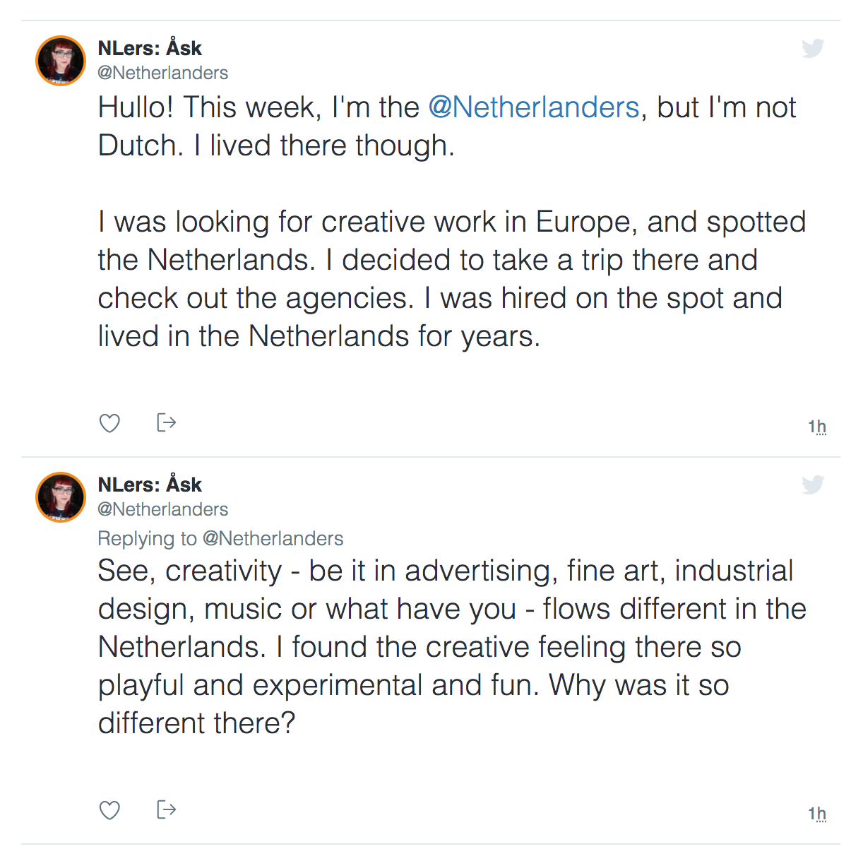 Well, sort of. I was invited to host the @Netherlanders Twitter account, which is like the @Sweden account once was, an account that has a new host every week. The host is tied to the Netherlands in some way and will discuss all things Dutch or anything on their mind. So I decided to chat about creativity, naturally!