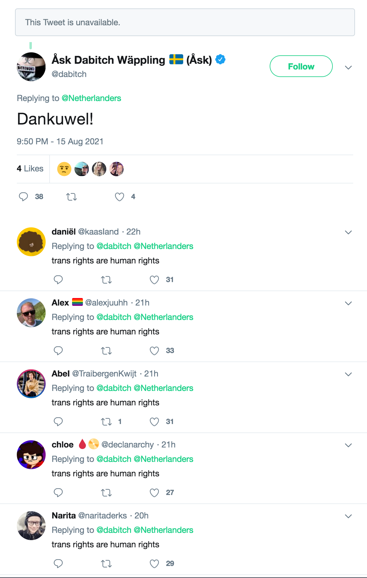Coincidentally it was the same thing that the previous host tweeted out in his last tweet before leaving: "trans rights are human rights." It looked like this: