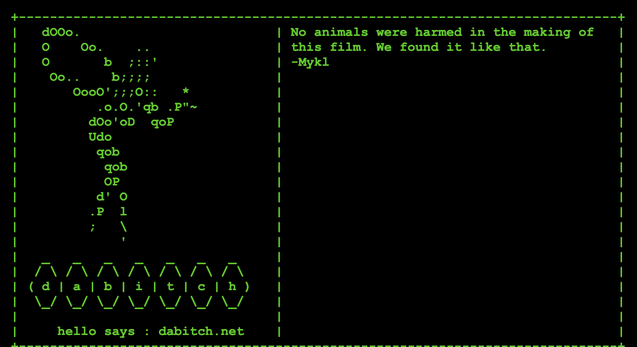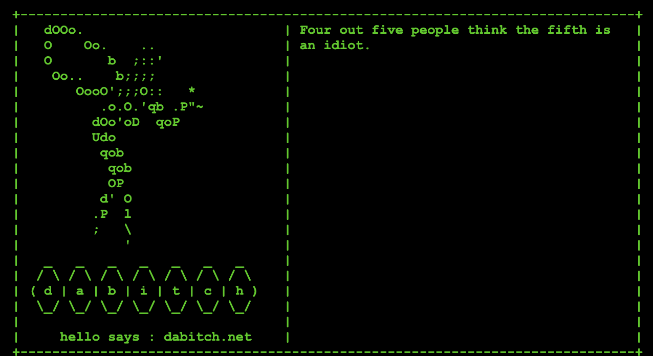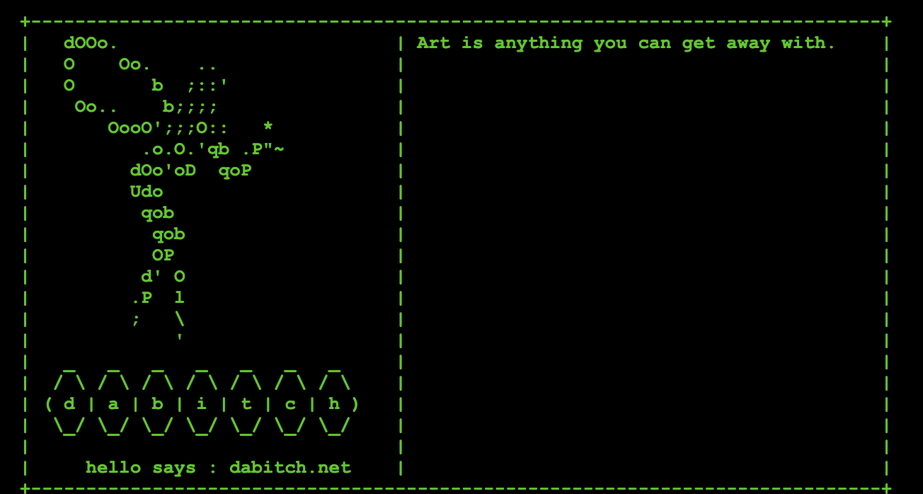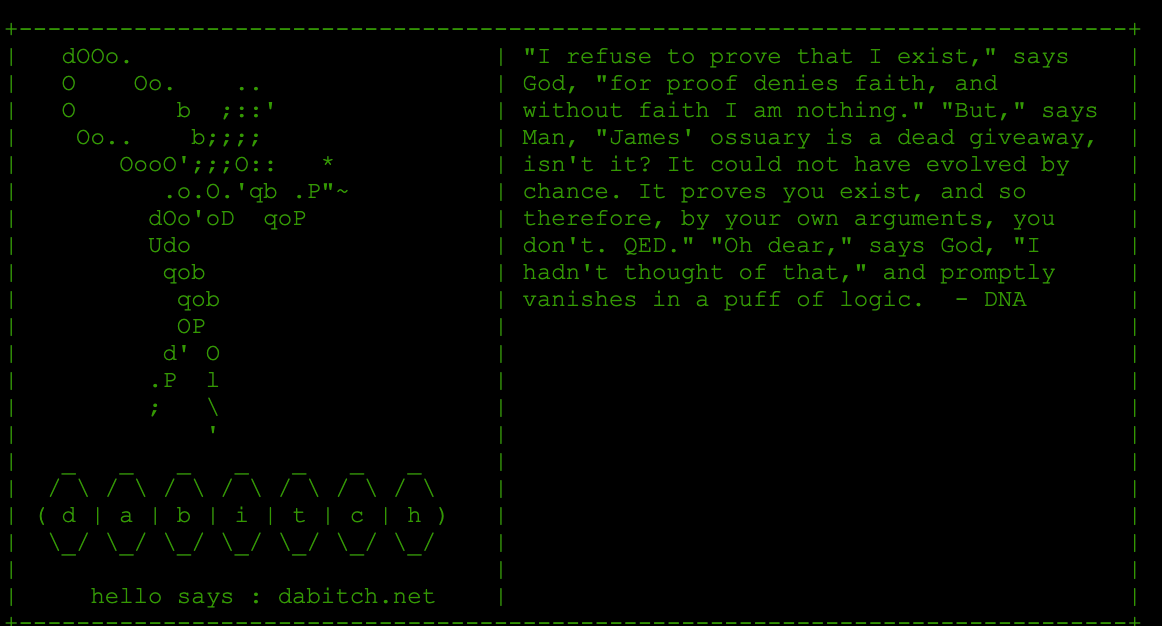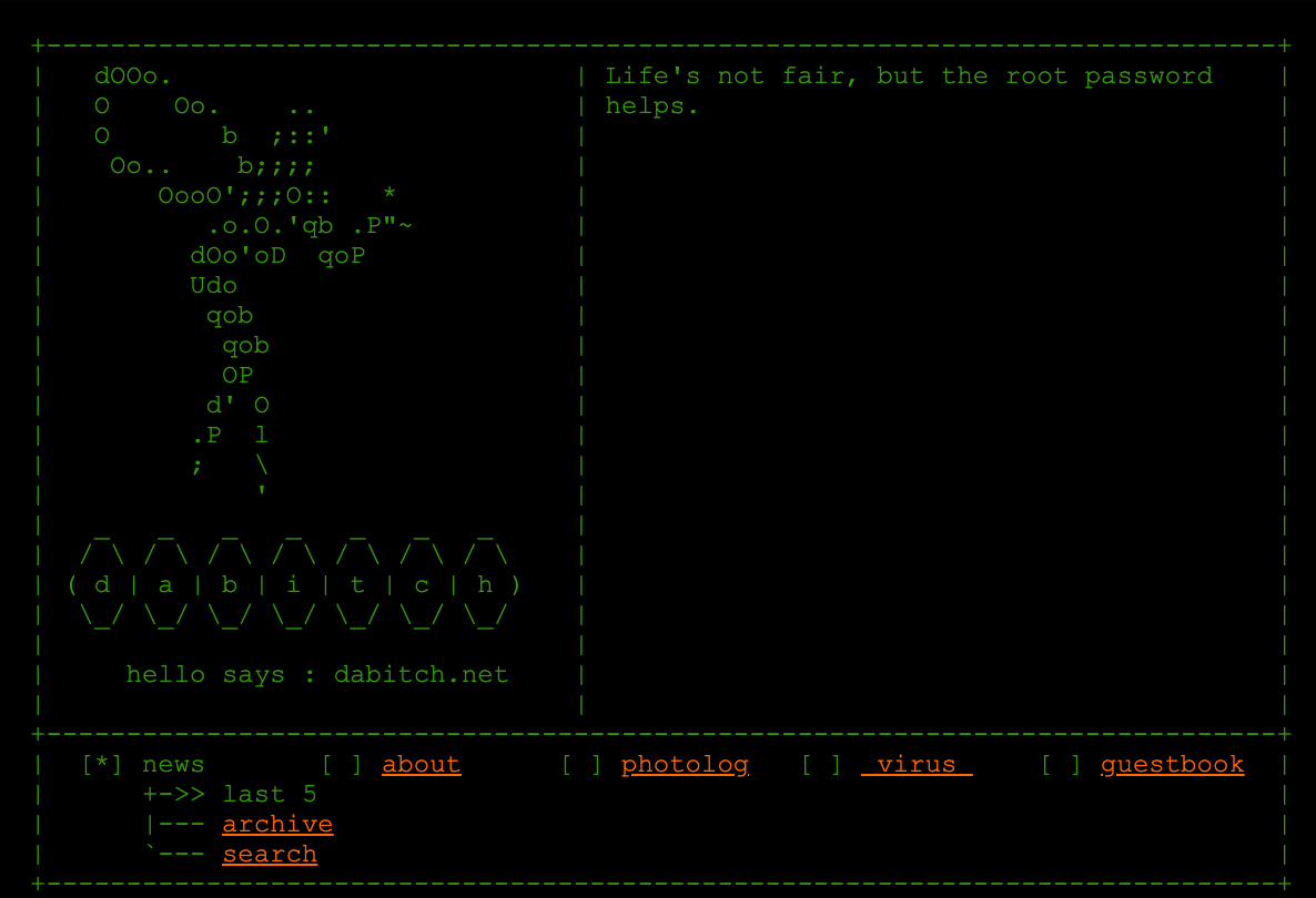 Meanwhile, in the directory of my .sig-files, I also added ascii art and a collection of quotes to each email that I sent out. I would use figlets to make "dabitch" stand out in a fake ASCII version of a font, and I would carefully select and make sure that my favored monofont would be how this was presented to the recipient. No matter if they used Outlook or Gmail or whatever. Eventually, all of this fell apart, as recipients could change everything in their email readers, and ignore the HTML around my sigfile. So, I stopped.