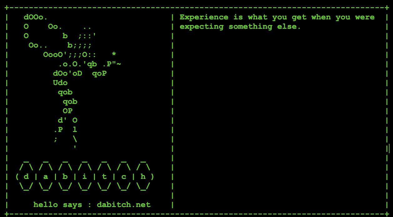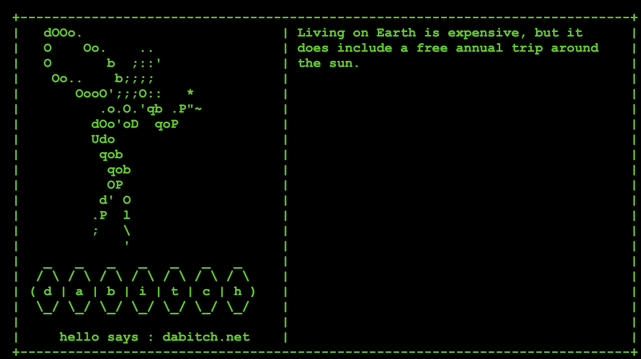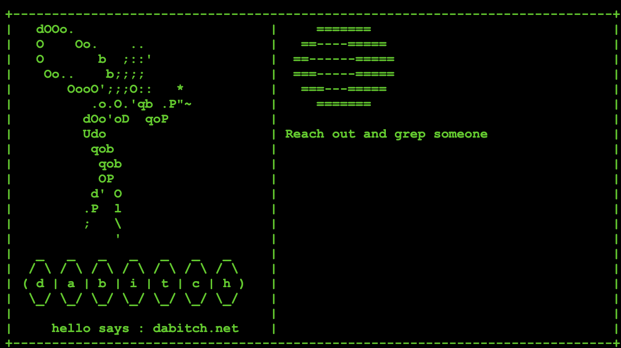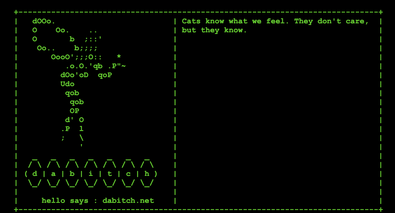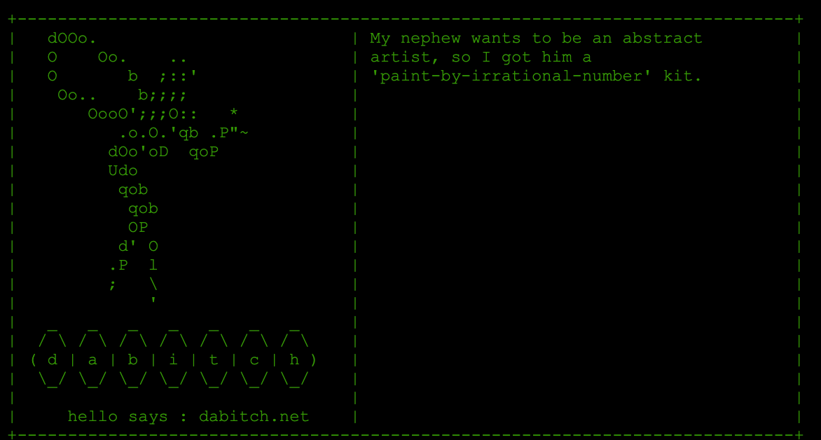 Meanwhile, in the directory of my .sig-files, I also added ascii art and a collection of quotes to each email that I sent out. I would use figlets to make "dabitch" stand out in a fake ASCII version of a font, and I would carefully select and make sure that my favored monofont would be how this was presented to the recipient. No matter if they used Outlook or Gmail or whatever. Eventually, all of this fell apart, as recipients could change everything in their email readers, and ignore the HTML around my sigfile. So, I stopped.