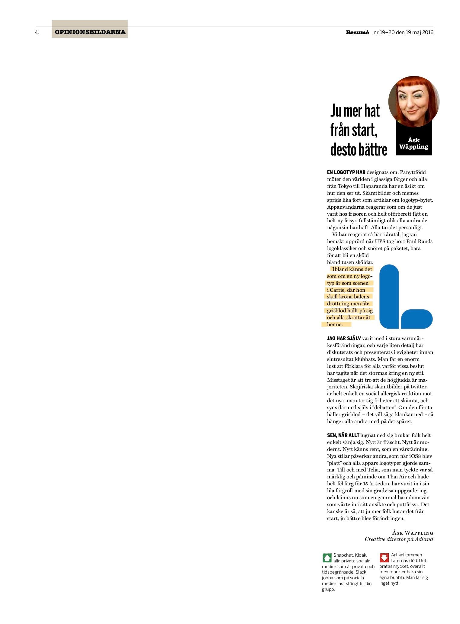 En logotyp har designats om. Pånyttfödd möter den världen i glassiga färger och alla från Tokyo till Haparanda har en åsikt om hur den ser ut. Skämtbilder och memes sprids lika fort som artiklar om logotyp-bytet. Appanvändarna reagerar som om de just varit hos frisören och helt oförberett fått en helt ny frisyr, fullständigt olik alla andra de någonsin har haft. Alla tar det personligt.