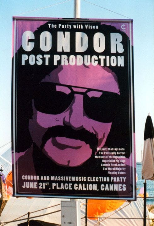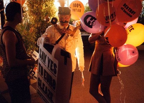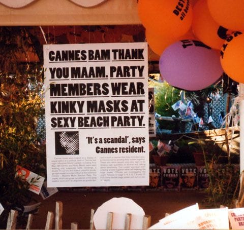Our french announcer carried political broadcasts all over Cannes with his golden speakers blaring out marching music, drumming up the political fever we need tonight. To the left is Jan Dirk Bouw and the dress with the balloons on the right is yours truly.