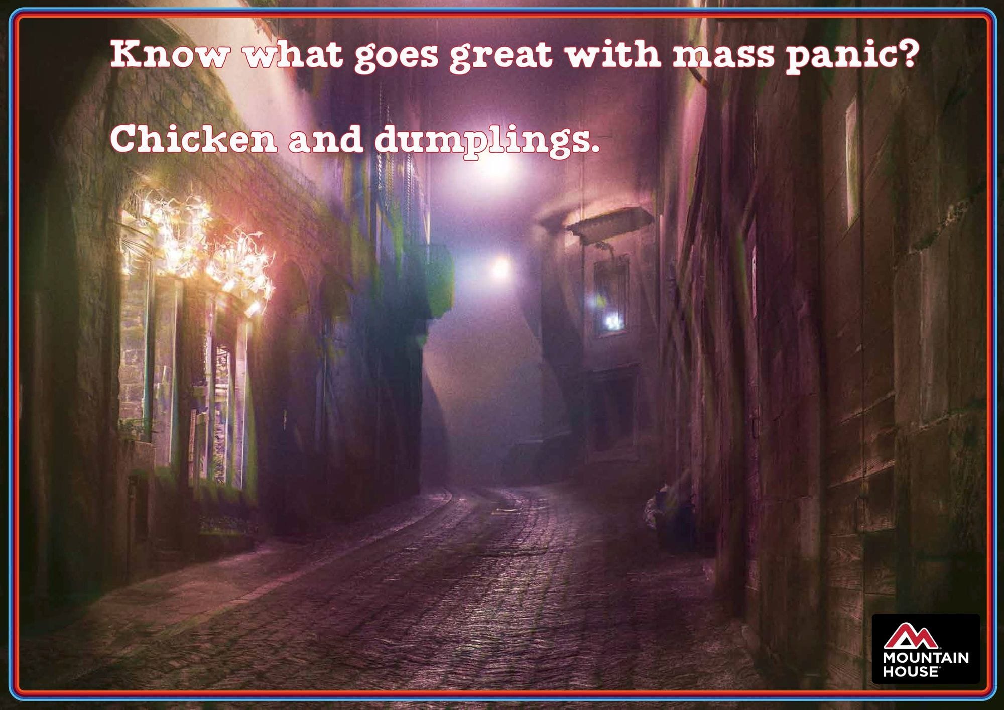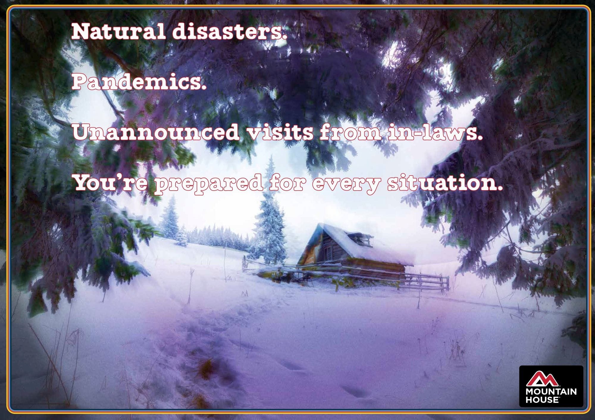 When there is a pandemic and you're eating freeze-dried meals, you may find that you suddenly have a campaign idea. At least we did, so we approached Mountain House with a storied history of providing MRE's for the armed forces back in the 70's. They are also big with campers, as well as people who plan for long-term emergencies. Since we're sick of the "we're all in this together" messaging and are desperately in need of a laugh right now, we decided to make these funny.