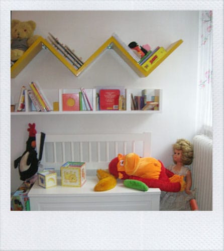 She has a Jonas Bohlin zink shelf on the wall which I spraypainted 'the right yellow' to match my turntable back in -92 (yes, that was bad of me but I don't care) and underneath it another one for smaller books. Her seat here stores hundreds of small toys and the old doll is yet another flea market find.