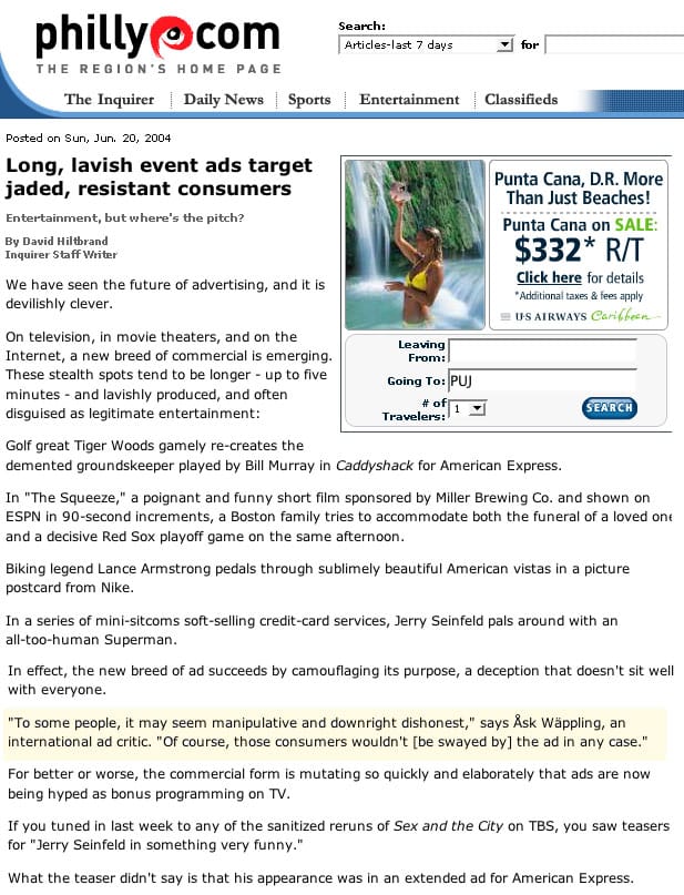 David Hiltbrand wrote about the "long, lavish events that target jaded consumers" June 20, 2004 and got a quote from us, the "international ad critic" from Adland.