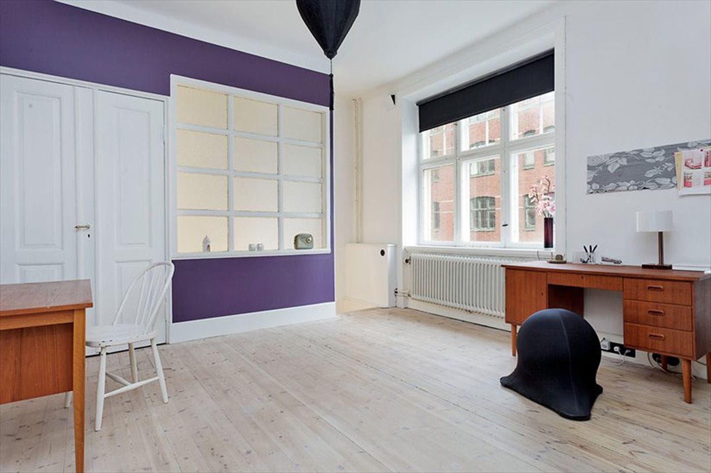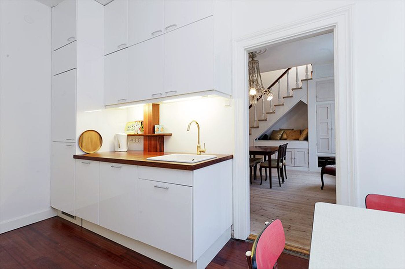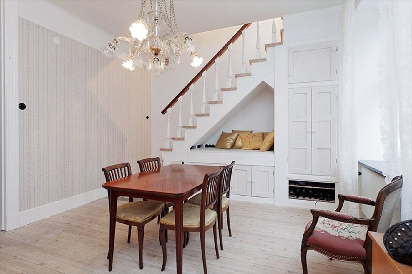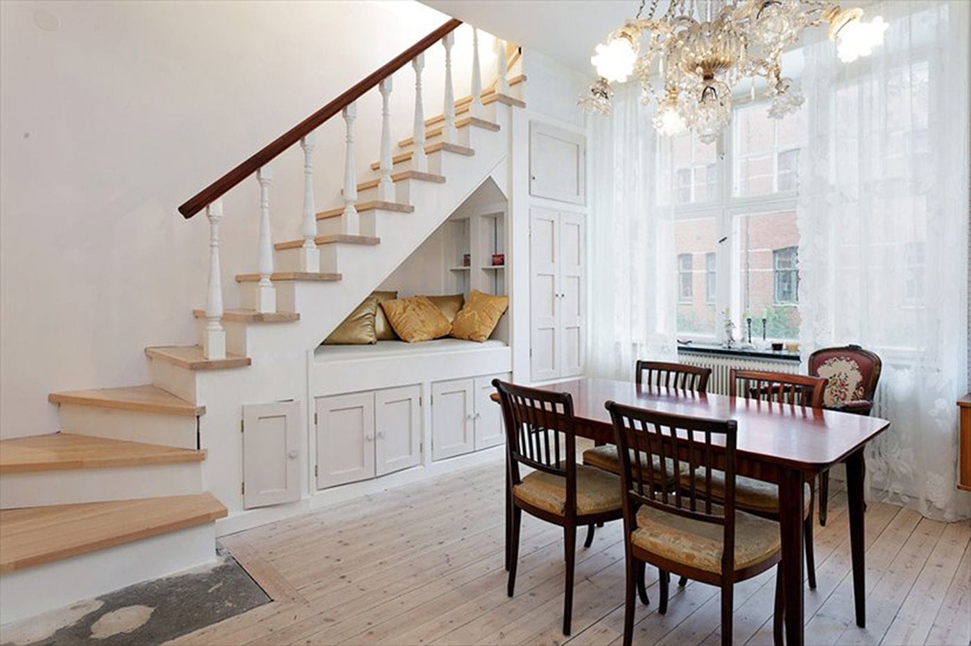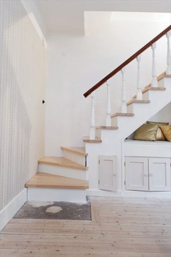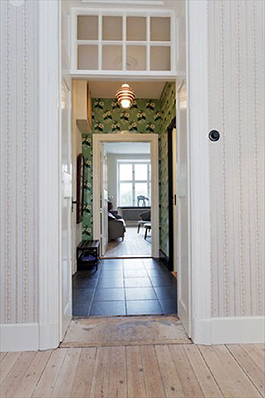 To allow for sunlight to illuminate the staircase between the floors, a window was installed instead of a wall, allowing for a great deep closet space at the end of the stairs. All stair wood was from Genbyg.dk, a place that salvages items from buildings, allowing us to have a pure mahogany bannister from the same era as the apartment. Basically, the project was to add back what had been stolen, including the correct era stucco in each room.