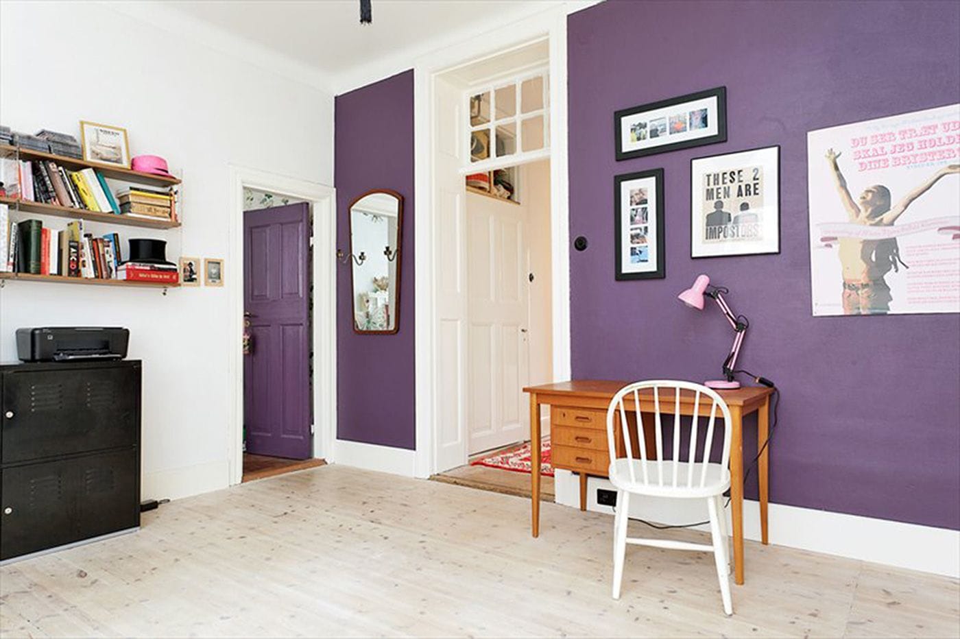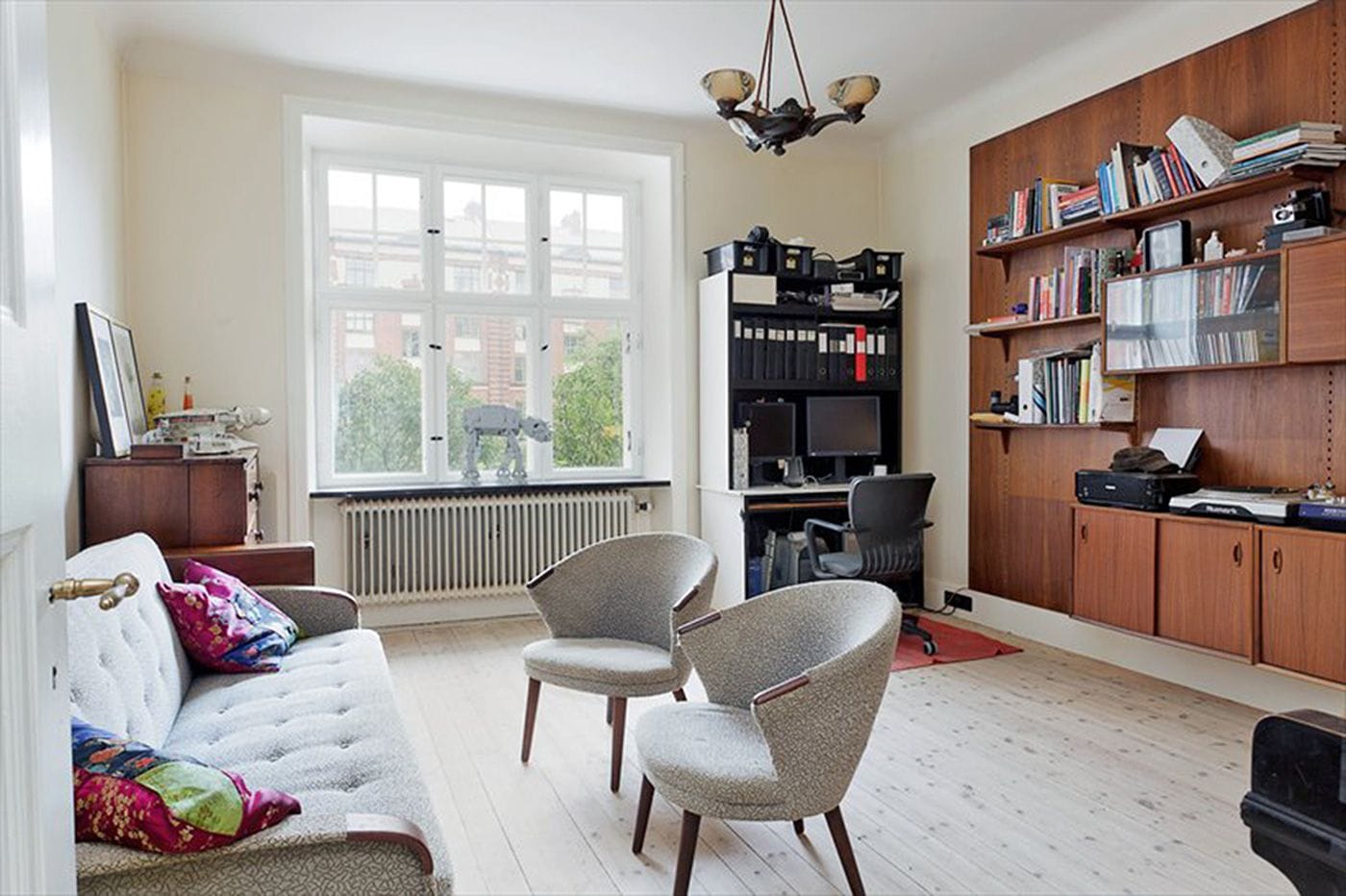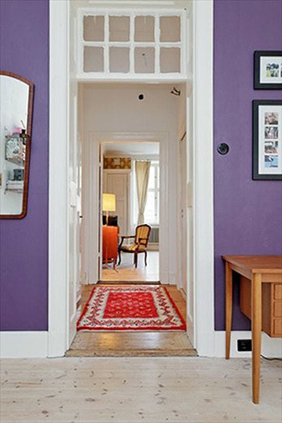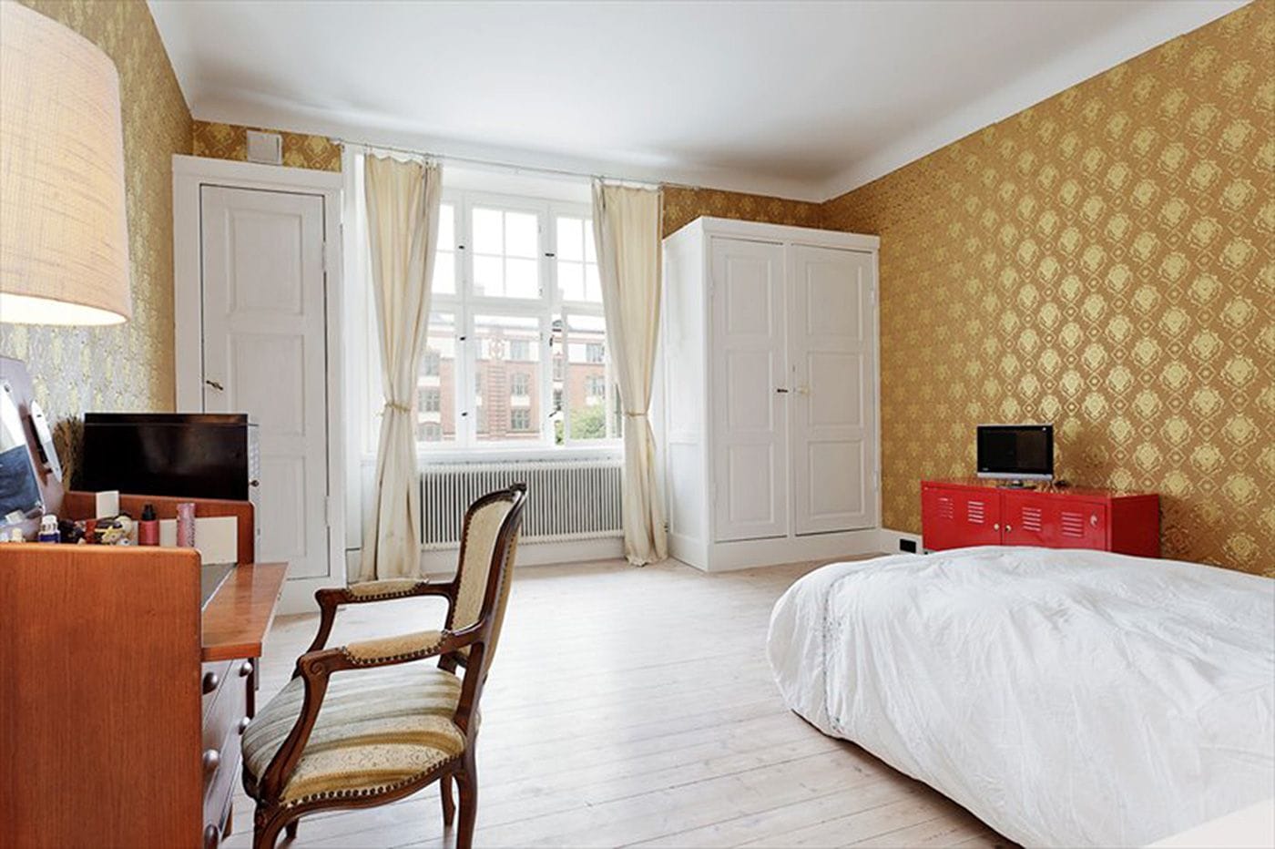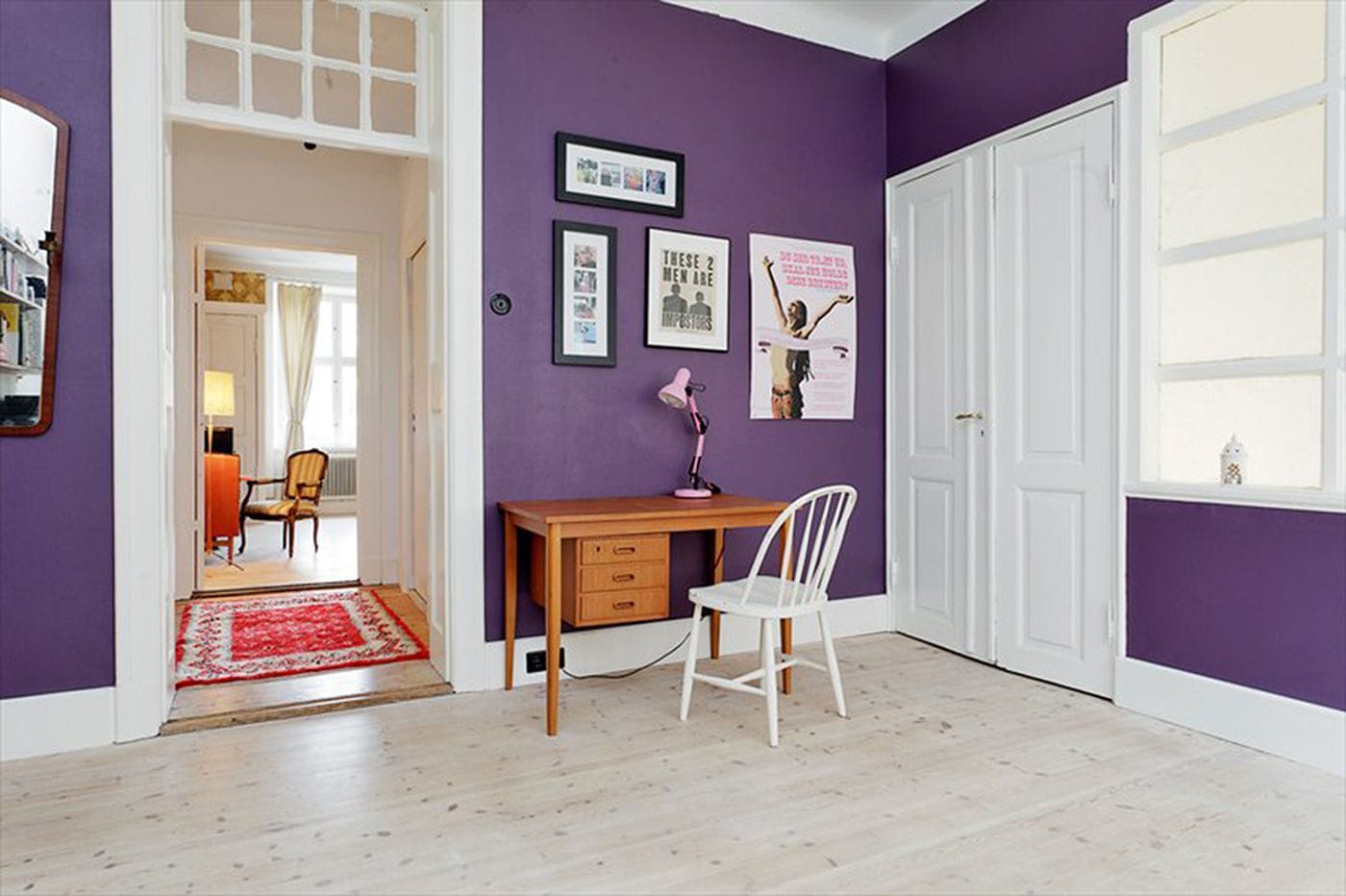 To allow for sunlight to illuminate the staircase between the floors, a window was installed instead of a wall, allowing for a great deep closet space at the end of the stairs. All stair wood was from Genbyg.dk, a place that salvages items from buildings, allowing us to have a pure mahogany bannister from the same era as the apartment. Basically, the project was to add back what had been stolen, including the correct era stucco in each room.