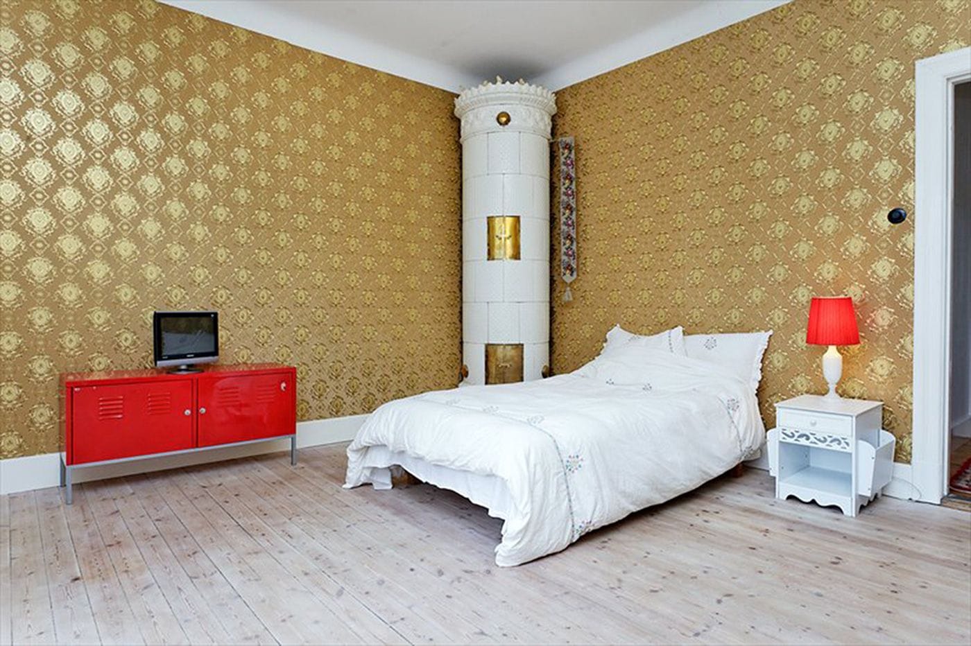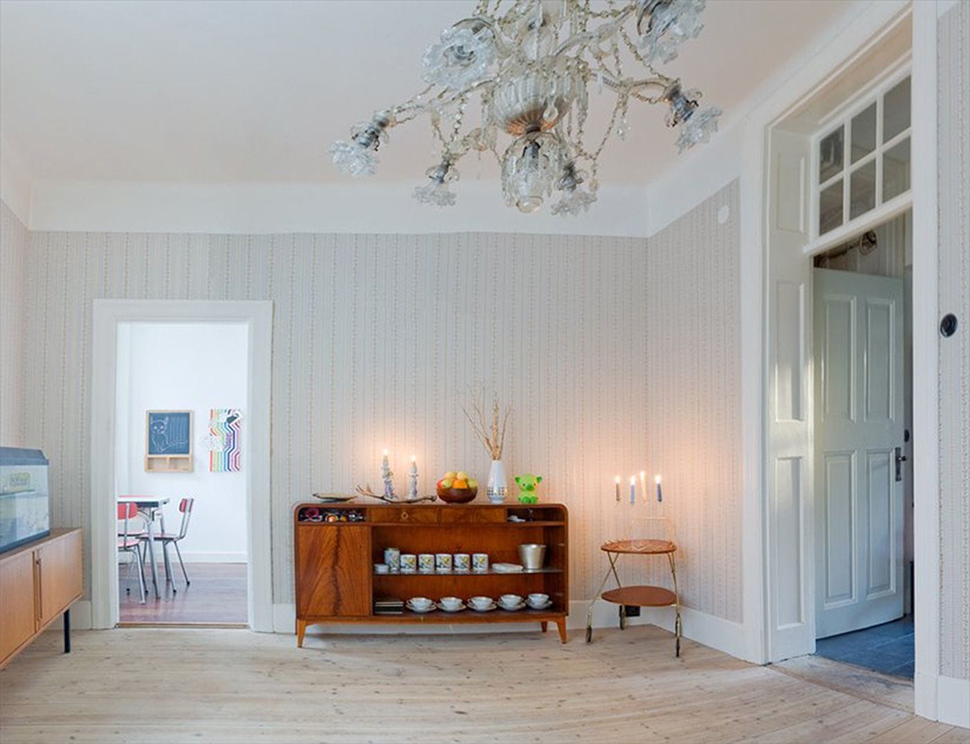 Correcting the mistakes of poor 70s and 80s renovations in a 100-year-old apartment. New electric wiring and bakelite switches added. All baseboards were changed for a uniform and era-correct baseboards. Wallpapers from the 1950s and 1930s were added to complete the look.