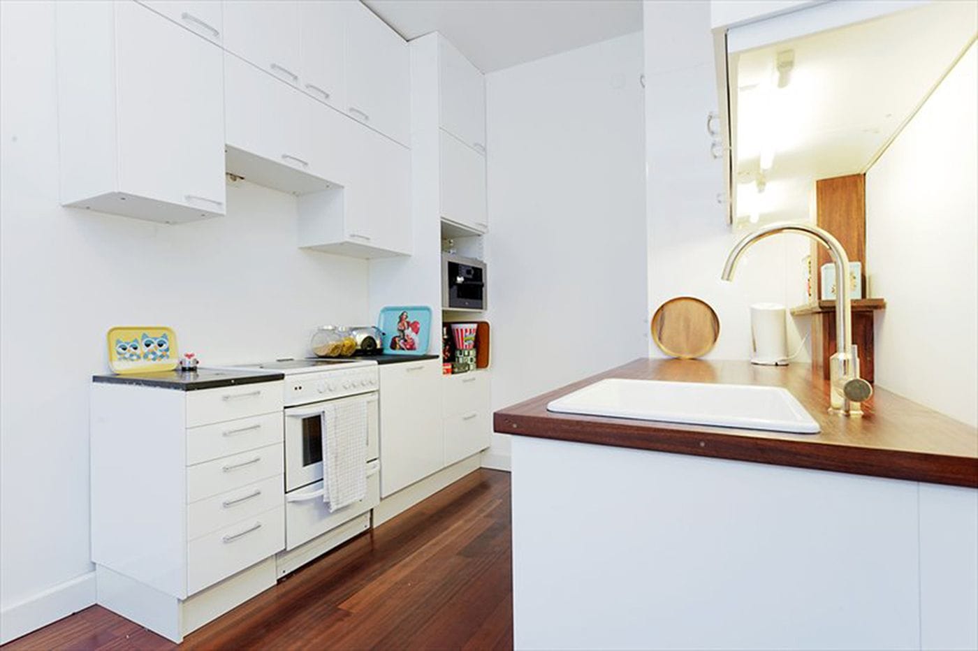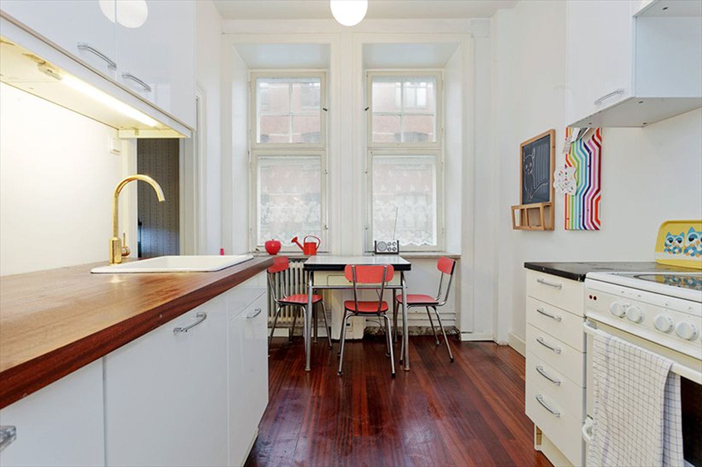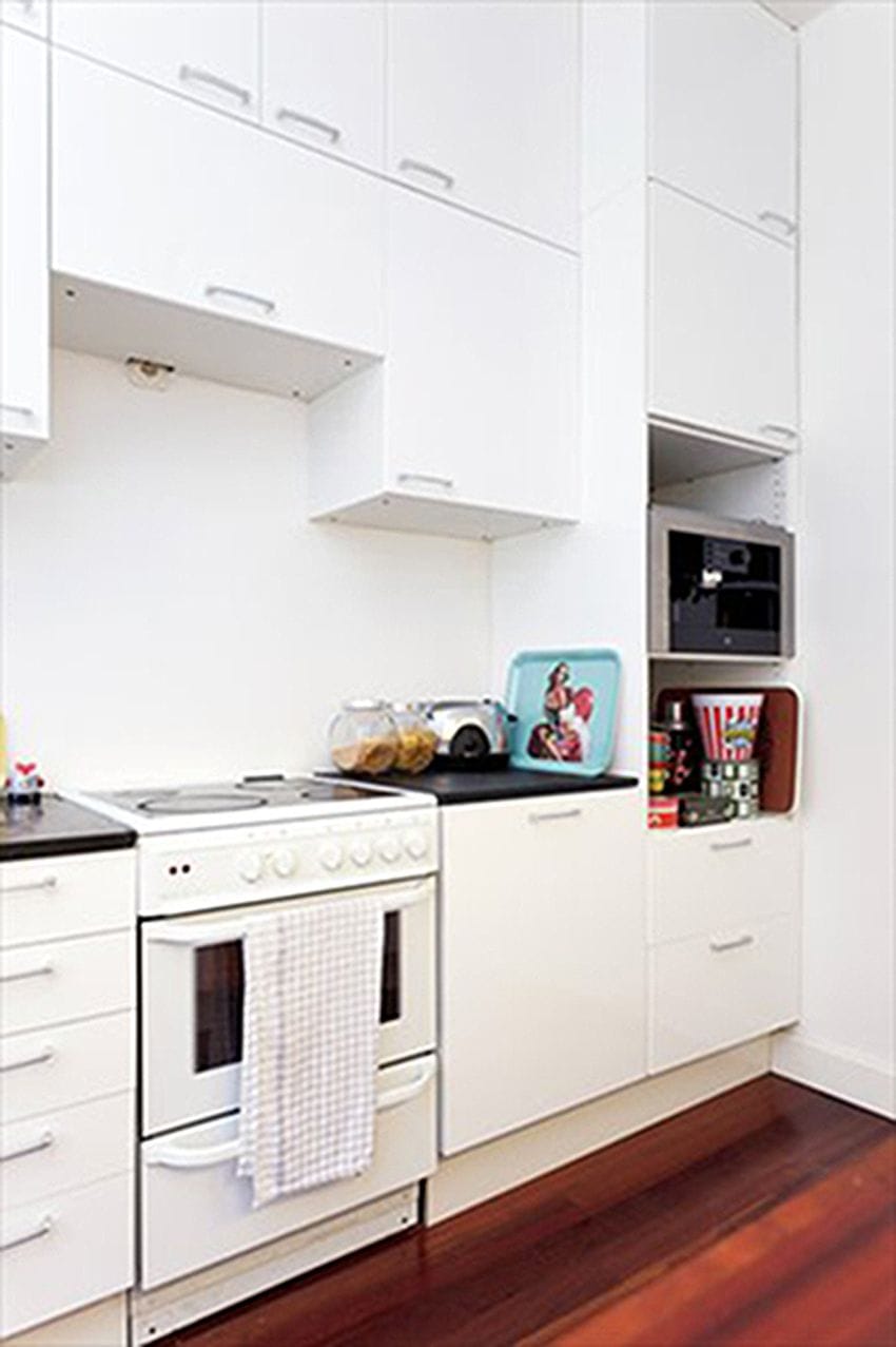 All original doors were rescued from decades of poor paint jobs, and carefully both oiled and painted again. Same with the doorways, where the original windows had been hidden underneath wood planks. Floors were salvaged from under bad linoleum and whitewashed to give a brighter look. In the kitchens on each floor, the floorboards were so damaged only a new floor was the option. On the bottom floor kitchen, recycled Merbau was used, and in the upstairs former kitchen, oiled mahogany.