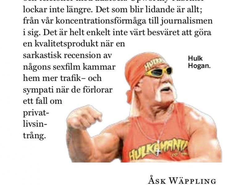 Läsarna tröttnar, laddar sina datorer, plattor och telefoner med adblock. Upworthy-rubriker lockar inte längre. Det som blir lidande är allt; från vår koncentrationsförmåga till journalismen i sig. Det är helt enkelt inte värt besväret att göra en kvalitetsprodukt när en sarkastisk recension av någons sexfilm kammar hem mer trafik– och sympati när de förlorar ett fall om privatlivsintrång.