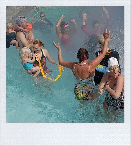 The email inviting us was pretty straightforward: “Get dressed up in gear that you may swim in. Crazy shit. Bear suits! Platform shoes!” So we did, and there was silver platform shoes represented, as well as neon pink underwear and day-glo orange nailpolish, eighties sunglasses, two-toned suits made from two suits, potato sack-outfits, glittering blue turbans and men in dresses.