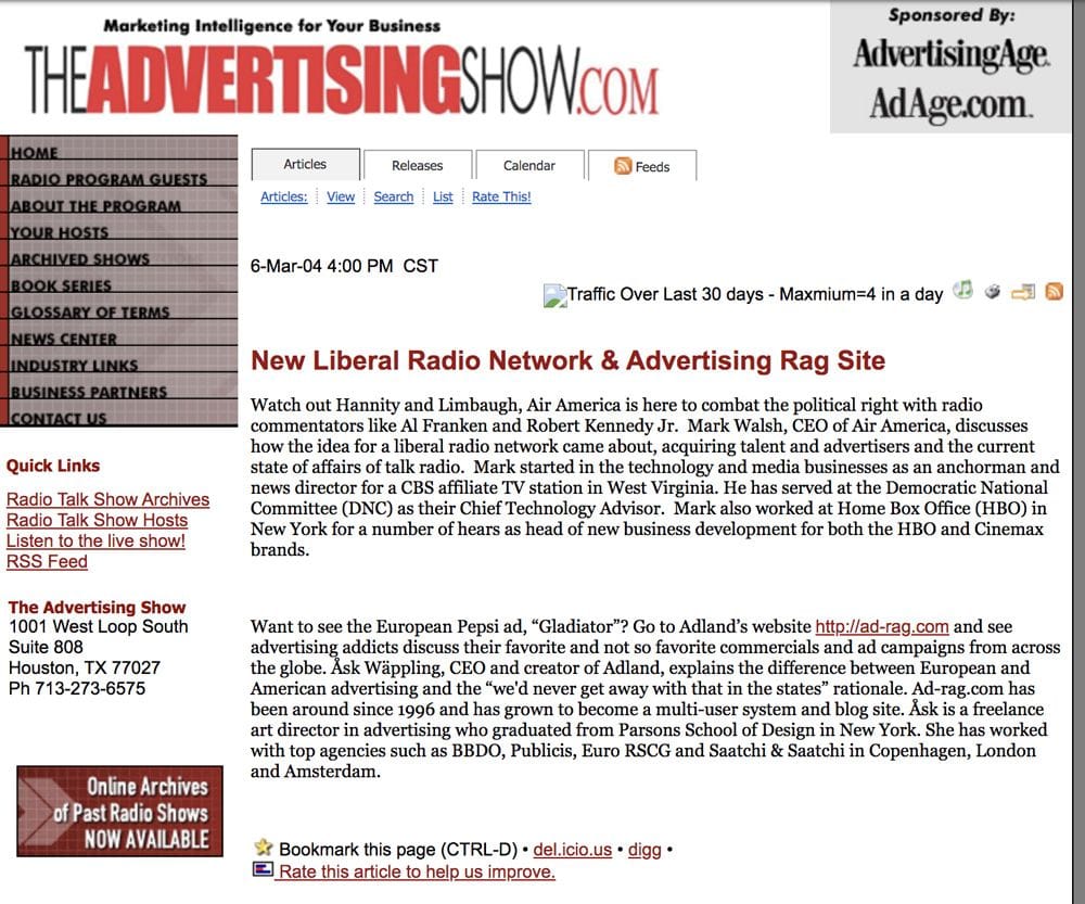 The Advertising Show used to be announced every week on Adland, and they also had me on the show once. "New Liberal Radio Network & Advertising Rag Site"