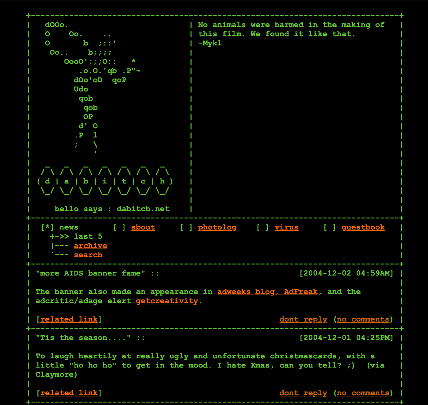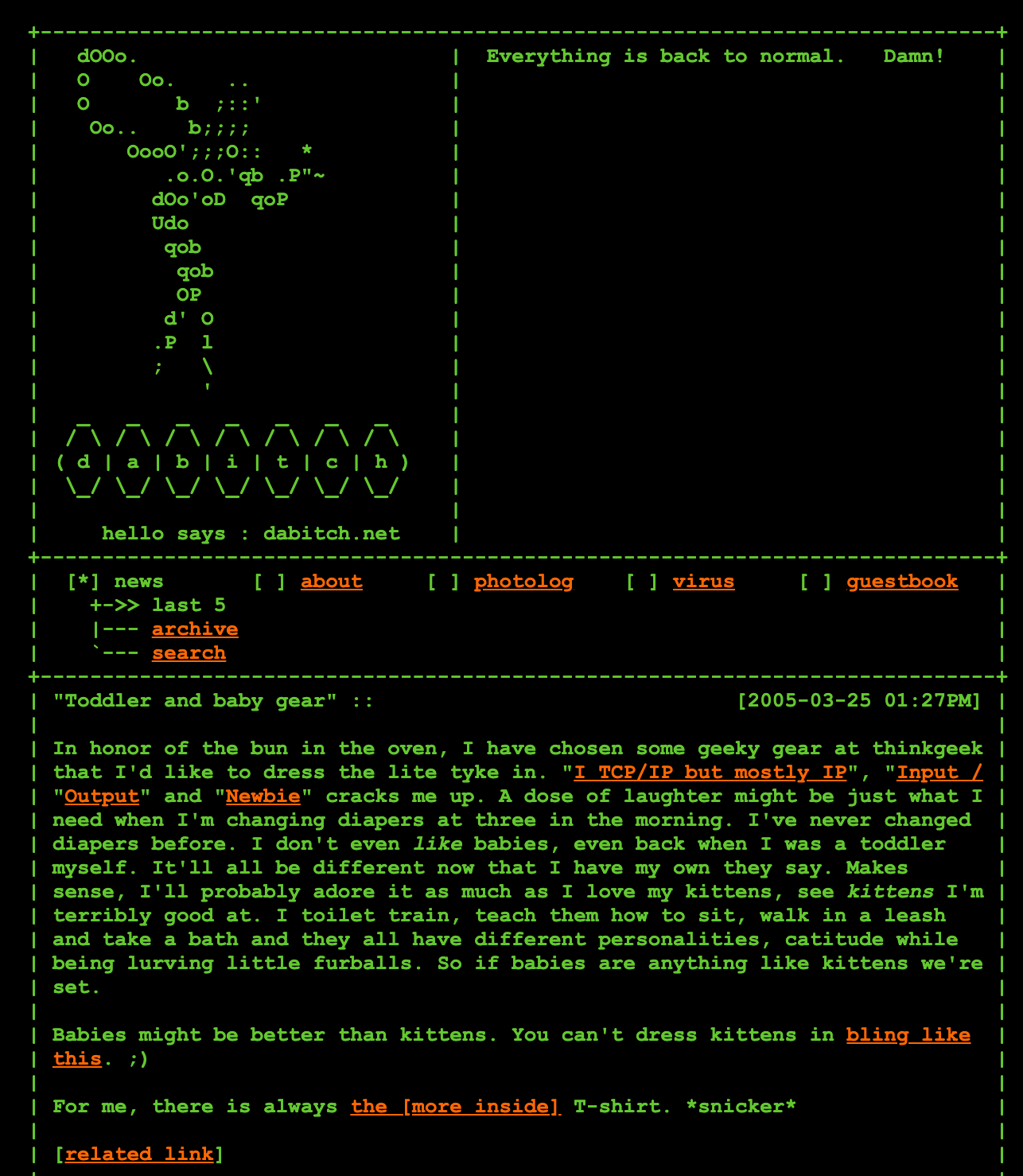 Which the ASCII log sort of is. This simple blogging site was written entirely in PERL which generated the look of it in ASCII characters only. No images. Commenting was open, and each post had a "related link" that was the main subject of the post.