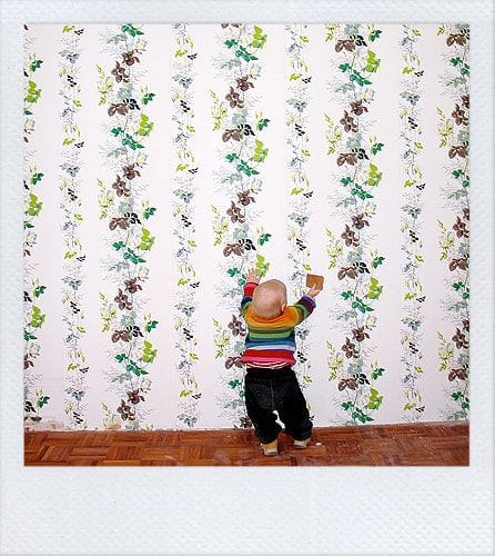 Perla chose her own wallpaper. Perla loves her wallpaper, and we painted the bottom half of the wall with magnetic paint before papering, so she can put magnets everywhere that she can reach - a game that never gets old. Trivia, this wallpaper was the first batch of old wallpapers that Tapetorama got when he started his shop.
