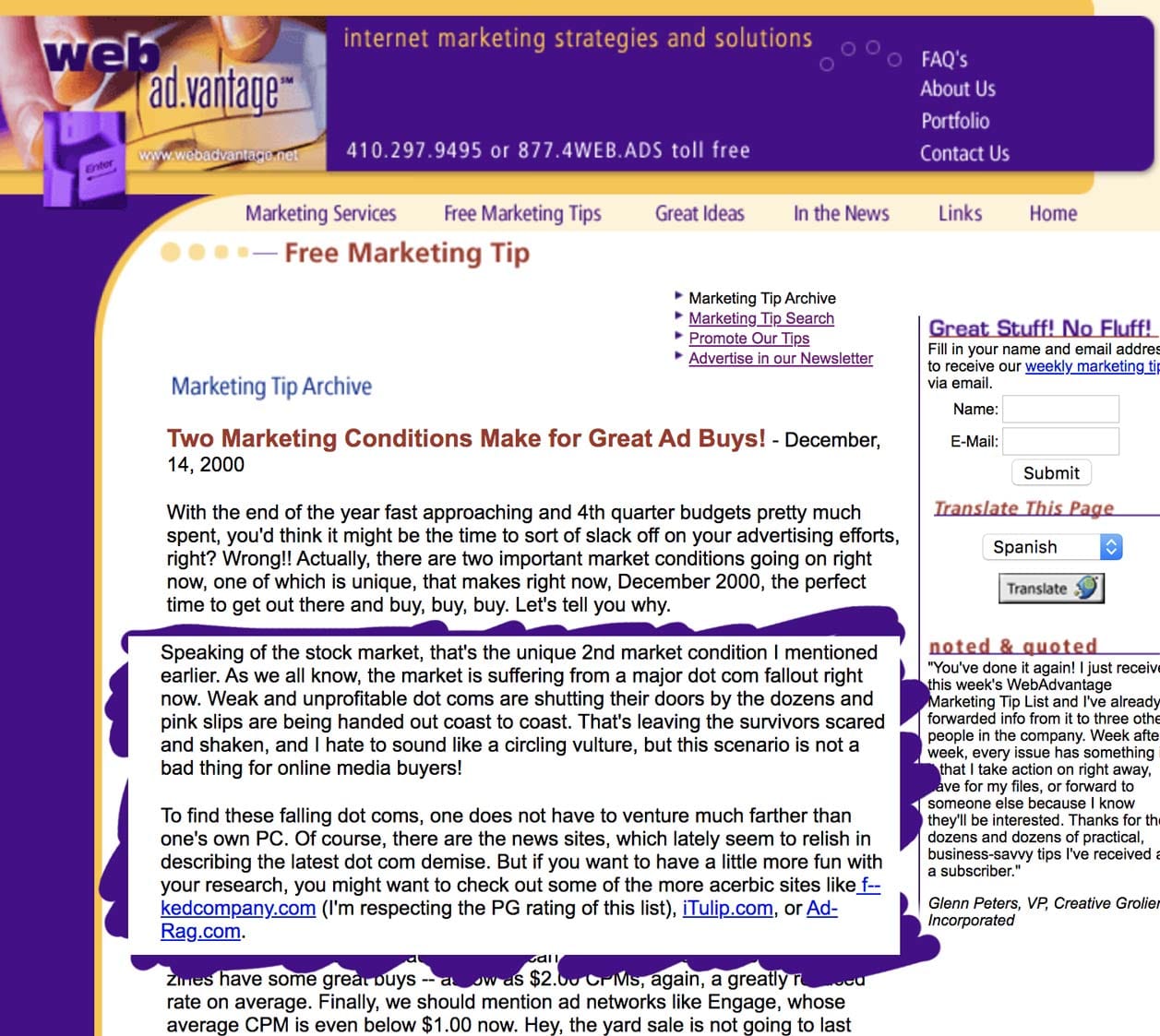 "Speaking of the stock market, that's the unique 2nd market condition I mentioned earlier. As we all know, the market is suffering from a major dot com fallout right now. Weak and unprofitable dot coms are shutting their doors by the dozens and pink slips are being handed out coast to coast. That's leaving the survivors scared and shaken, and I hate to sound like a circling vulture, but this scenario is not a bad thing for online media buyers!