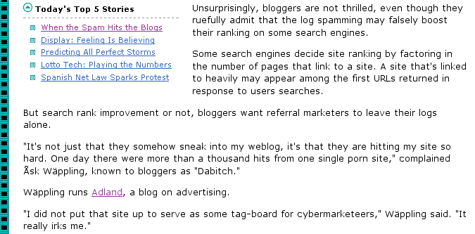 Wired wrote "when-the-spam-hits-the-blogs" about a nuisance called "referral marketing."